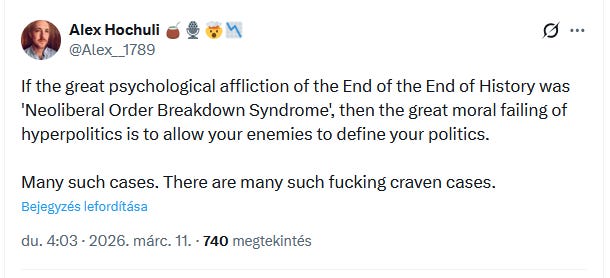 Ha Orbán Viktor azt mondja, hogy legyenek akkugyáraink, akkor a magyar liberális nyilvánosságot nagy részét hirtelen nem érdekli a zöld átállás; ha pedig azt mondja, hogy válságban van az európai politika, akkor mi dafke besöprünk szépen minden gondot a szőnyeg alá, és önmagunkat gaslightoljuk, hogy minden rendben van.