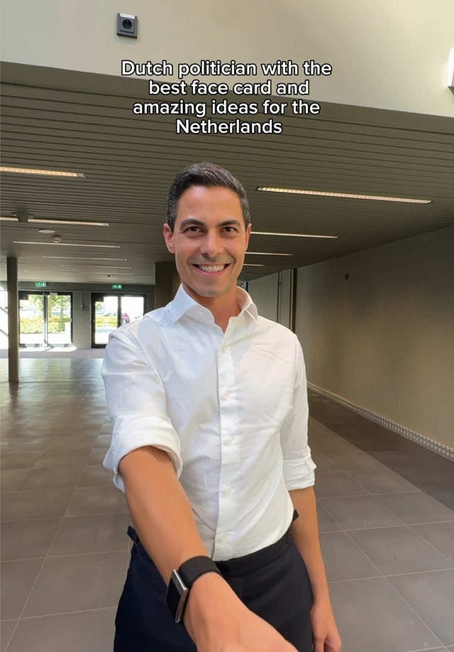 Rob Jetten esetében az egész TikTok- és Reels-világ utalásrendszerének a mozgatásával jön létre a Mamdani esetében felvázolt logika. Itt van például egy első-választóval történő kézfogós videó egy agyonhasznált TikTok-mémbe ágyazva: