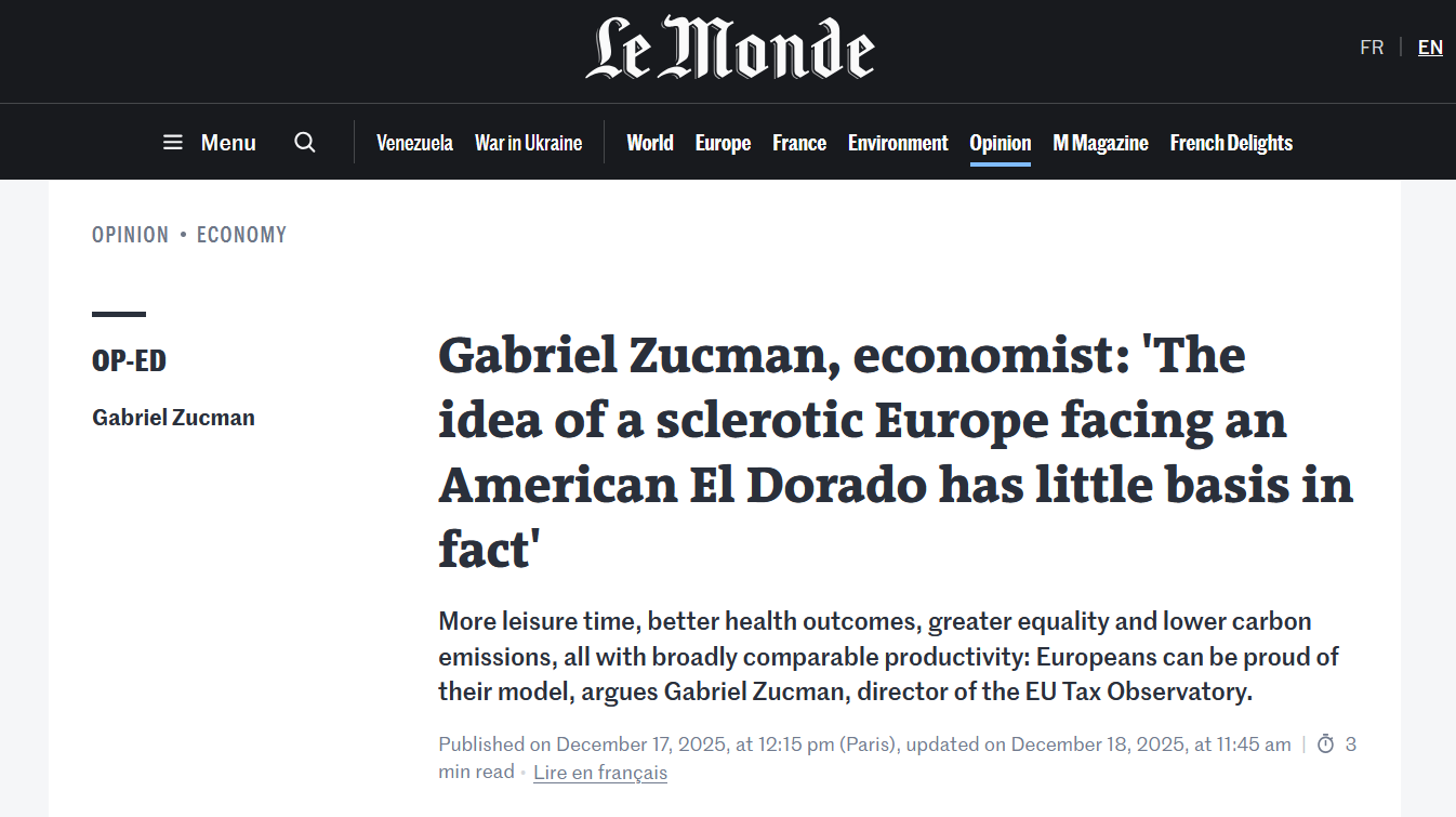 Nagyjából a Nincs más választás megnézésével párhuzamosan jött szembe a francia sztárközgazdásznak, Gabriel Zucmannak a Le Monde-ban megjelent publija, amelyben tévedésnek nevezi az elmeszesedett Európáról és az dinamikus Amerikáról szóló diskurzust.