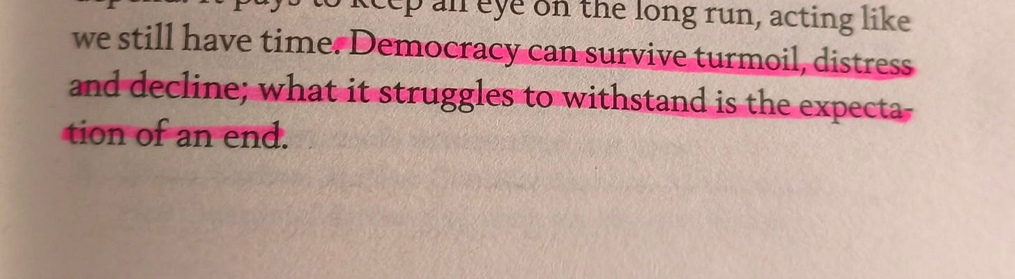 “A demokrácia képes túlélni a zűrzavart, a veszélyt és a hanyatlást. Amivel nehezebben küzd meg, az a vég bekövetkeztének előérzete.”